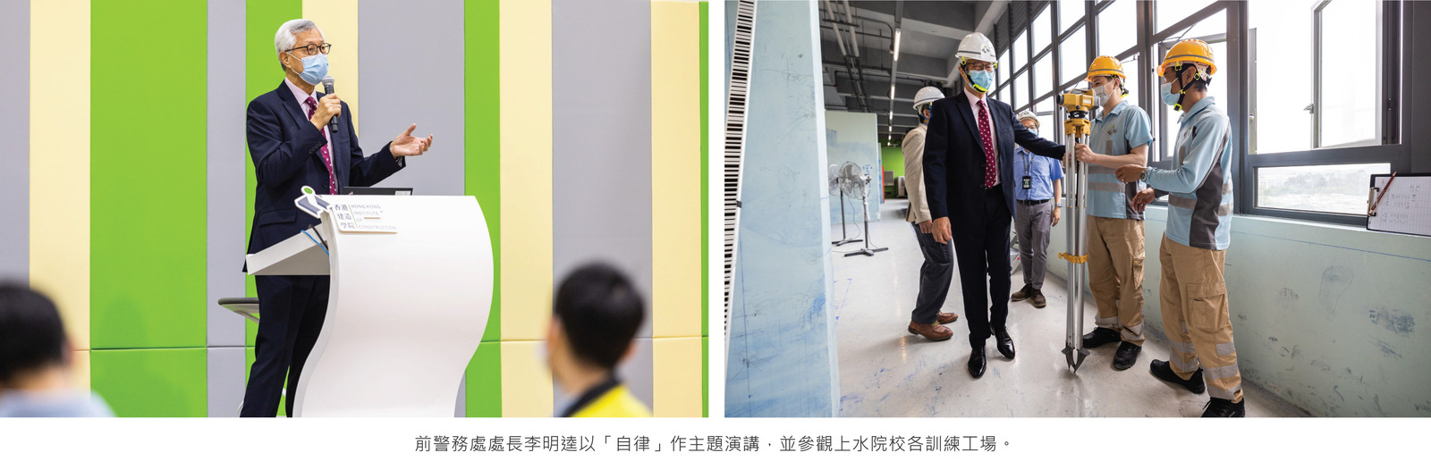 香港建造學院除了培育學生專業建築工藝,更協助學生認識正確的人生觀,享受健康快樂的生活。建造學院不時找來成功的社會人士與學生分享經驗,擴闊視野,最近請到前警務處處長李明逵與同學探討「自律」的議題。李 Sir 用「衣、食、住、行」四個日常生活方式來介紹實踐「自律」的方法,亦不時將例子與建造業的良好作業聯繫起來,相當生動貼地,例如在「住」方面,他提到在警察學堂受訓時,每天都要準時起床,自己收拾被褥,穿着整齊制服後才可以開始一天的工作。他借這個例子提醒大家做事要有手尾,每日收工前要將工作的地方收拾整潔,保障工地、自己和他人的安全。