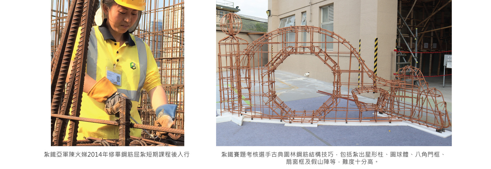 公開組紮鐵項目亞軍陳火娣是一位女中豪傑,個子並不特別高大,但很有自信,原來背後也有一個動人的故事。她的父親陳老先生以前是一名紮鐵判頭,因為年事已高,希望女兒可以繼承父業,便鼓勵娣姐到建造學院接受培訓,學習紮鐵工藝。雖然始終並沒有接手父親的公司,但娣姐加入永光鋼鐵工程已經多年,開始協助打理地盤紮鐵的工作,很有滿足感。