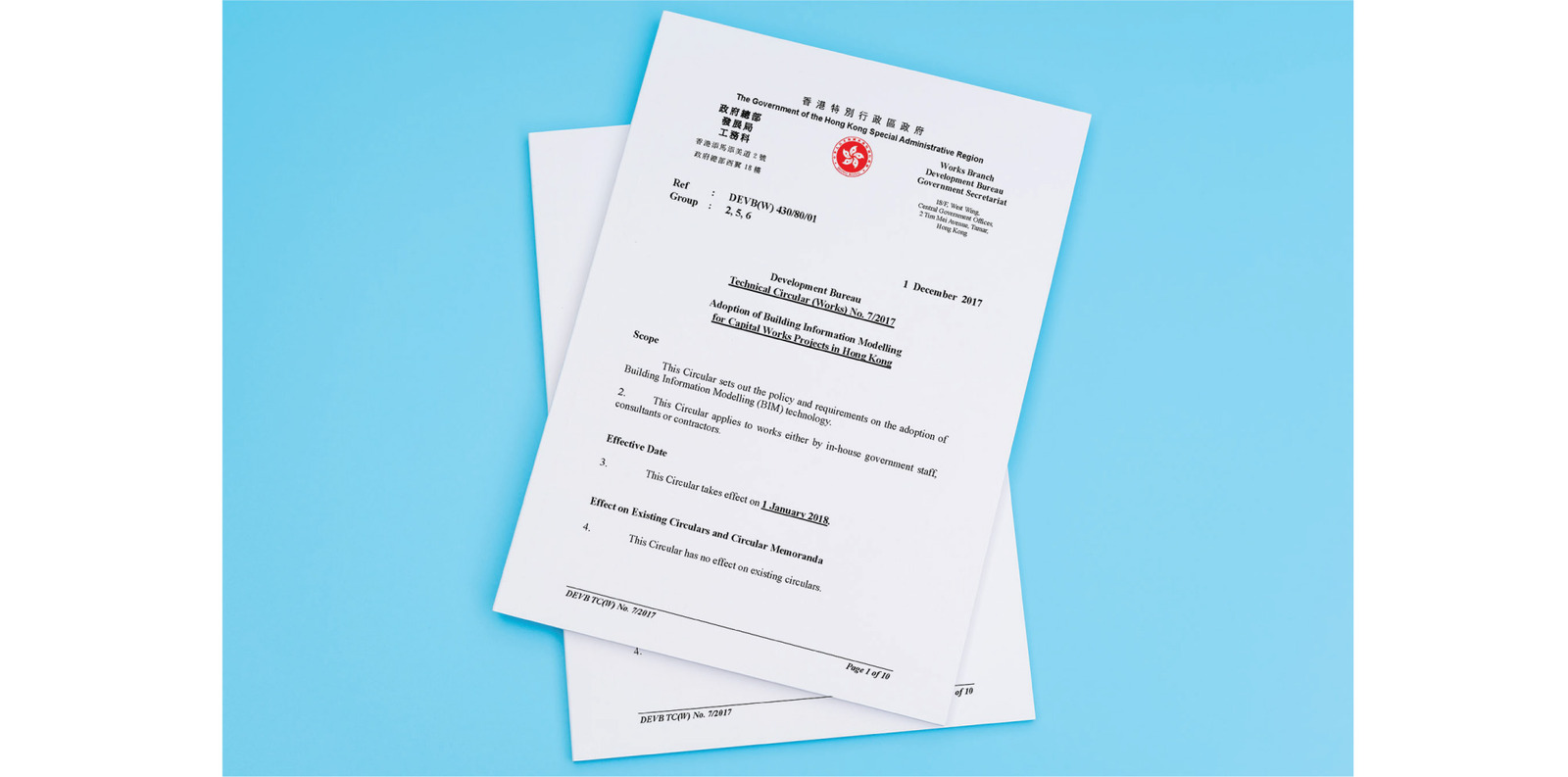 BIM 近年在香港得以蓬勃發展,主要是因為發展局一紙技術通告(工務)編號7/2017, 指示屬下工務部門由2018年1月開始,估算三千萬以上的工務工程必須全面使用 BIM 技術來進行研究、策略、設計、施工和管理。一紙令下,全城執行。期待很快便可以看到另一份技術通告要求所有建築設計法定審批申請的圖紙必須以 BIM生產及以電子形式遞交,那個時候 BIM 在香港便真的全面落實。
