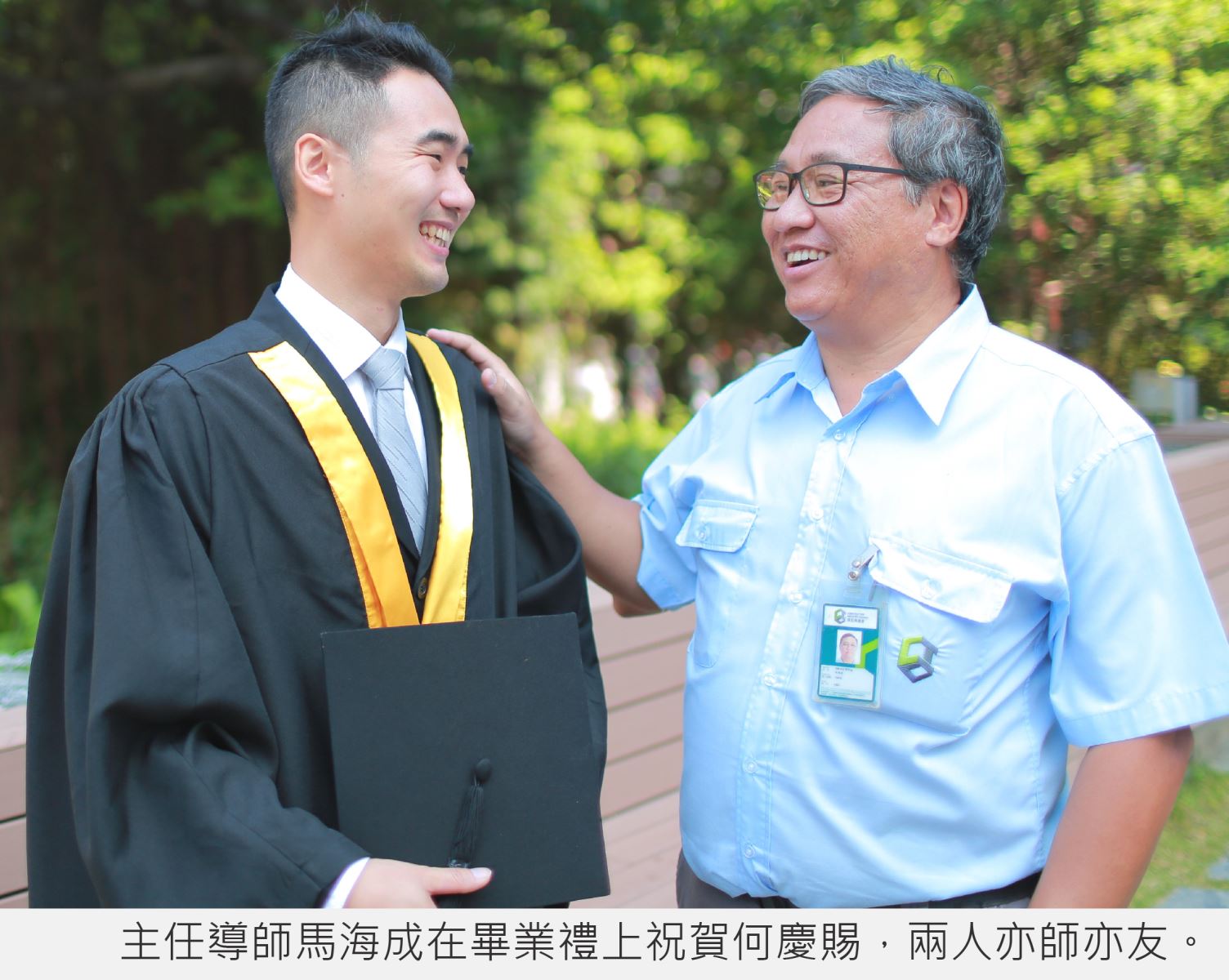 「建造業監工課程」的何慶賜代表畢業同學致謝詞。他除了感謝導師對他的栽培外,更道出他與任職木模板技師父親的感情關係。慶賜小時候從不探究父親的工作,只知道他是一名地盤工,用辛勞養活全家。現時自己入了行,才明白註冊木模板大師傅並非只靠勞力,技術和經驗也非常重要;令他對父親多了一份敬重和關愛。兩父子現在無所不談,父親已成為他的人生導師,感情更加深厚。他笑言期待將來有機會與父親拍住上,創一番事業。