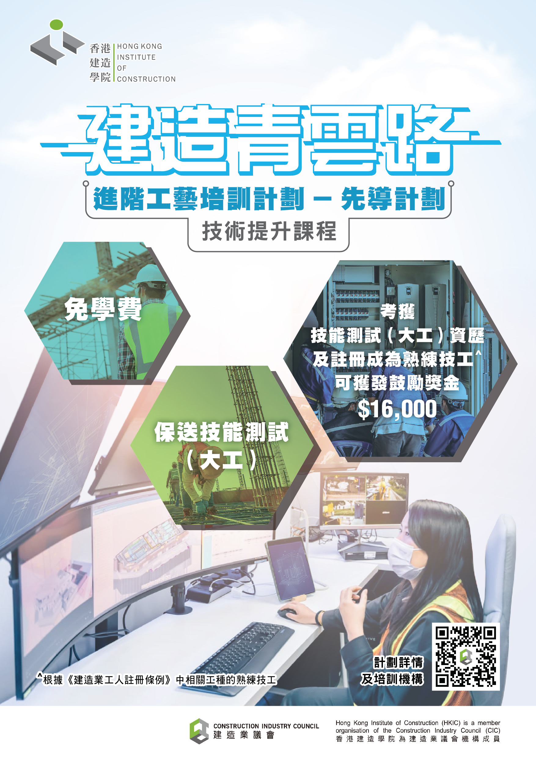 此課程由半熟練技術工友向相關培訓機構遞交申請,課程免學費,學生畢業獲得大工資歷及註冊成為《建造業工人註册條例》中相關工種的註冊熟練技工後可獲獎金港幣16,000元。
