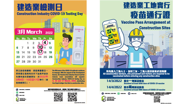 As an industry pioneer, we understand the importance of being proactive in combating the pandemic surge to prevent site personnel from infection. With the support of the Development Bureau, the CIC together with the industry’s trade unions and trade associations have joint hands to implement "Construction Industry COVID-19 Testing Day" and "Vaccine Pass" from March in order to achieve Zero-Covid. Testing will be held on 4, 10 and 17 March, 2022. During these three designated days, all construction site supervisors are mandated to arrange for all construction workers and site personnel to undergo Rapid Antigen Tests (RAT) on construction sites, aiming to achieve the goal of “early identification, early isolation and early treatment of the infected”.