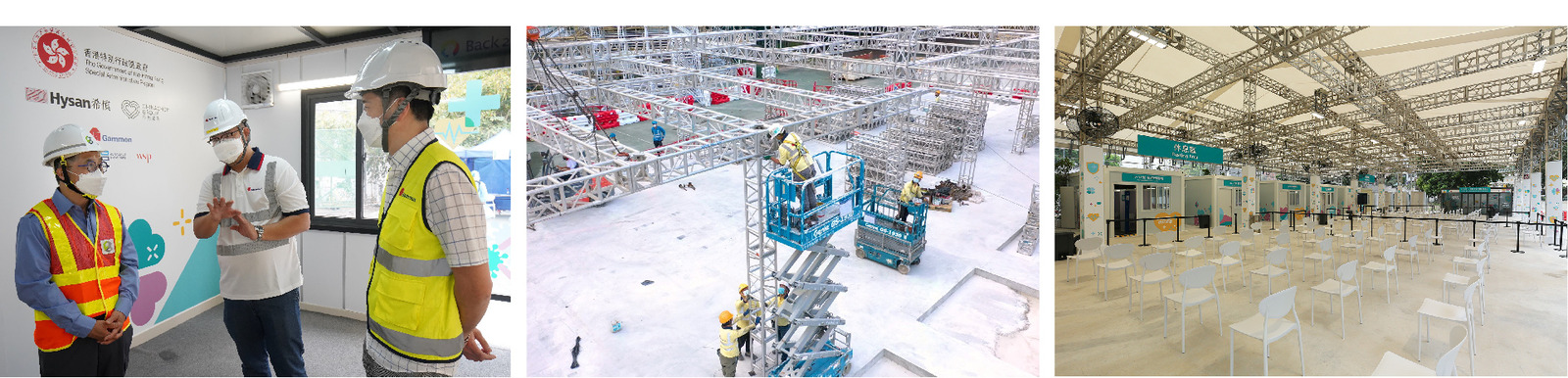 Hysan Development has teamed up with Chinachem Group to offer their joint site at Caroline Hill Road to the Government to set up a vaccination centre. After taking over the site, Gammon Construction immediately commenced advance works of construction and connect with suppliers on designing and producing MiC pre-fabricated modules, with the E&M facilities assembled in the factory. Installation of the 13 pre-fabricated modules completed in just two days and the site was handed over to the Government on 24th March. With concerted effort from all parties and the application of MiC, the project was completed in less than three weeks.