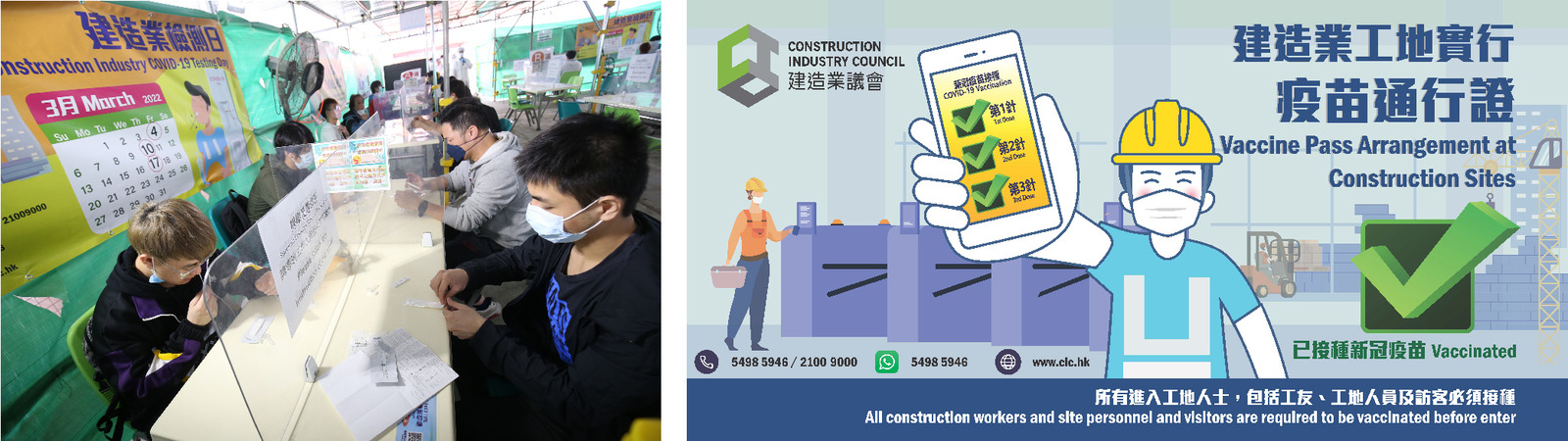 The construction industry in Hong Kong shares a spirit of unity. We leave no stone unturned as long as it should be done. The industry organised 5 Construction Industry COVID-19 Testing Days and successfully uncovered infected cases. Percentage of confirmed cases has dropped to less than 0.1% on the last Testing Day compared to the highest 1.8%, effectively cutting the chain of transmission. The second stage of the Vaccine Pass Arrangement at Construction Sites will be implemented on 14th April. By then, all construction workers and site personnel are required to have received at least two doses of COVID-19 vaccine to enter construction sites. Except for specified premises, construction industry is the first industry to implement Vaccine Pass Arrangement at sites, hoping to take the lead among other industries.