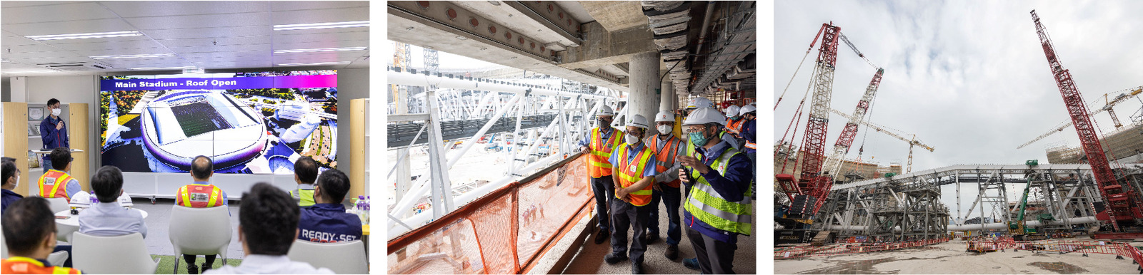 The main steel truss comprises large steel circular hollow sections, all prefabricated and welded in Mainland factories, then shipped to Hong Kong. As the site needs to be a temporary unloading dock, the team used 3D laser technology to scan the site and simulate the move-in placement of the main truss into the Main Stadium with the aim of identifying possible obstacles. In addition, each prefabricated component needs to be connected precisely and accurately. Therefore, 3D laser scanning is employed to capture raw field data for building a point cloud for inserting into the BIM model. The initiative previews any deviation between the 3D model and the design, enabling necessary revision of the design in time.