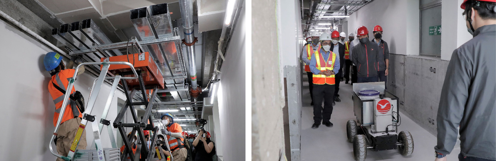The Multi-welfare Services Complex in Kwu Tung North is Shui On Construction and Materials Limited’s (SOCAM) first MiC project, and was applied to 42% of the total construction floor area. The MiC approach enables most of the work processes and interior finishes to be completed at a factory in the Mainland, then delivered and installed at the site. Such an approach effectively reduces on-site processes, manpower and risks of overhead work. The project has also applied a vast amount of innovative technologies, including Building Information Modeling (BIM), Design for Manufacture and Assembly (DfMA), artificial intelligence (AI), Digital Works Supervision System (DWSS), virtual reality (VR), robots, and so on. Additionally, it has incorporated advanced technologies developed by SOCAM’s in-house research and development (R&D) unit. For instance, AI and automation functions were added to the remotely controlled mechanical trucks, turning these manually operated trucks into automatic material carriers for heavy load transportation. This initiative helped to reduce the chance of worker injuries caused by heavy lifting. In addition, safety performance was continuously enhanced through the adoption of face recognition technology, smart helmet systems and safety management systems.