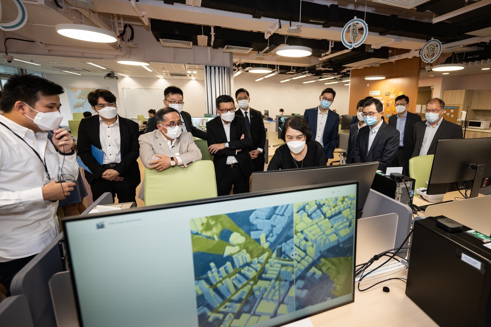 To better promote the application of spatial data, DEVB established the GeoLab in Kwun Tong in 2021. Workshops and talks, such as “Introduction to Artificial Intelligence (AI) and Machine Learning for Smart City Development", “Application of BIM/GIS Integration” and theme talks on “Environment and Health”, were held to encourage the public, start-ups, and the young generation to make use of spatial data in developing smart applications, and to stimulate the development of smart city. Sr. CHAN said that GeoLab offers a place for the young generation to learn about spatial data, despite the impact of Covid-19, GeoLab seizes every opportunity, for example a “STEM Parent-child Workshop” on creating an Interactive Web Mapping Application was held in April 2022 when schools were suspended.