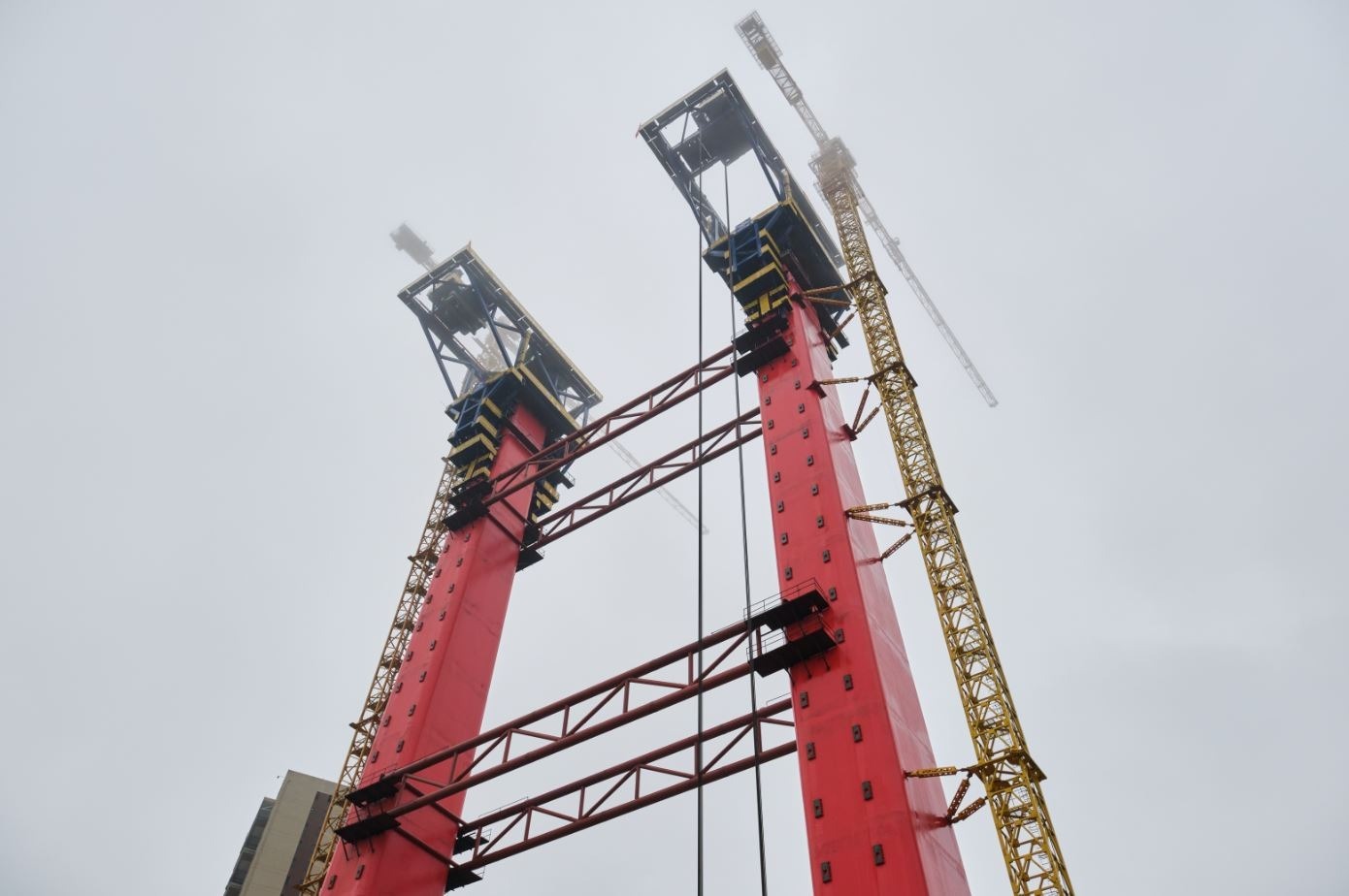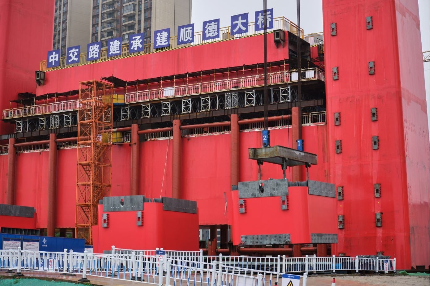 Most of the steel towers of cable-stayed bridges and suspension bridges in China were installed by floating cranes and tower cranes, and tower cranes are more commonly used for the installation of steel towers with divided sections due to their wider coverage. However, according to Mr. HUANG Kai-kai, the lack of tower cranes with lifting capacity of over 200 tonnes and their low utilisation rate in China prompted them to develop a tower hoist during the construction of the Shunde Grand Bridge. The tower hoist, which is hydraulically operated, has a vertical climbing capacity of 250 tonnes and is suitable for constructing bridge's cable towers, beams and steel box girders, enabling it to be used for three purposes. After continuous adaptation and improvement, the tower hoist completed the first lift of the tower in September 2022 and completed the lifting of section T17 in February 2023, with a total of 26 sections of left and right tower limbs. It took only 108 days to build up to 112 metres, with an average height of approximately 1 metre per day. The tower sections are manufactured in the factory and installed on site by means of an intelligent tower hoist, which effectively reduces the time required for working at height. To further ensure the safety of the workers, a smart control centre is set up on site to monitor wind speed, weather and cylinder pressure, while key technical staff stayed in the centre to monitor and direct the project operation via 360° cameras and multiple screens, so that only three people were required to work at height.