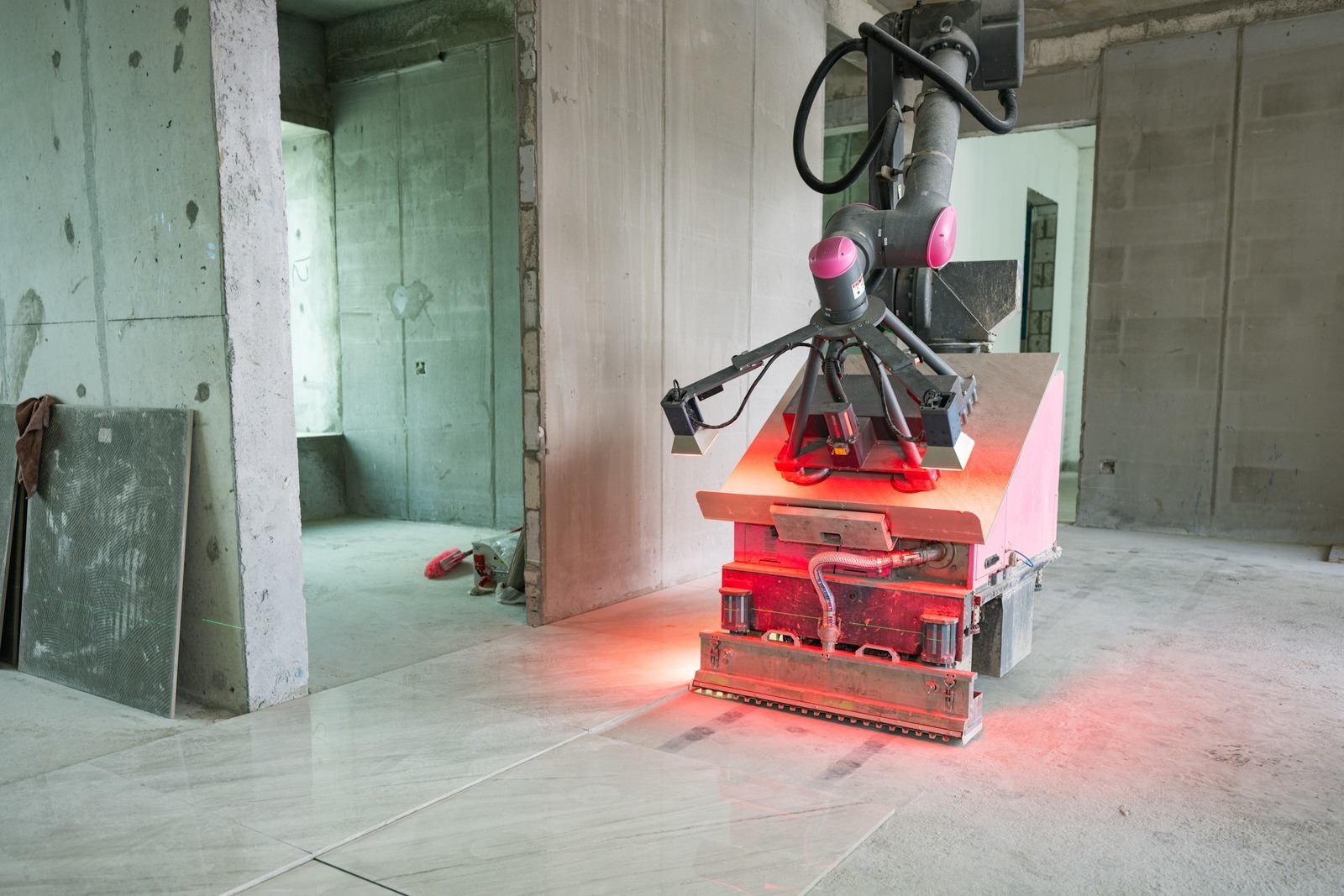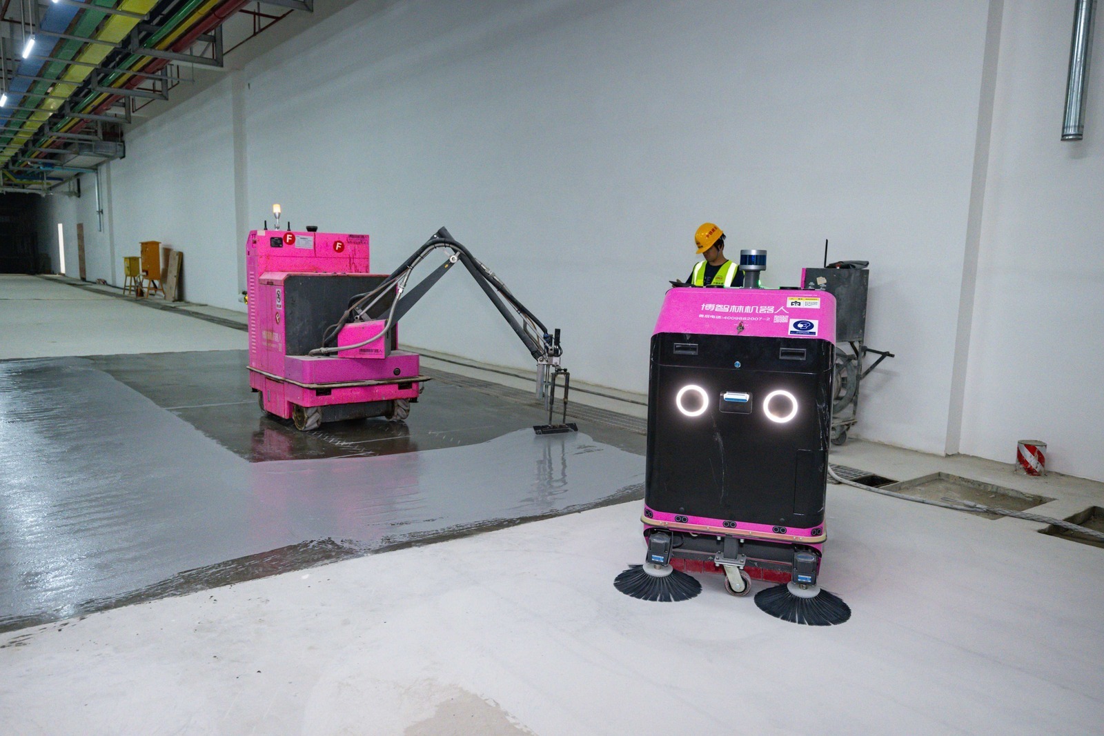 Bright Dream Robotic’s products are primarily painted in an eye-catching pink colour. Fully autonomous in nature, and only needed to be filled up with construction materials, the robots can triple the productivity compared with traditional construction workers. Though the construction process can be long and complex, a high level of efficiency can still be achieved when combining different construction robots’ functionalities. The group also visited the a project in Foshan, which was one of the pioneer sites that uses smart construction robots. The delegation witnessed a worker operating three construction robots simultaneously: the technician first selected the appropriate robots with the help of BIM tools. Then various robots of different functionalities, such as Putty Spraying Robot, Painting Robot and Measuring Robots can be assigned specific tasks. The robots can also accurately install floor tiles and wooden floorboards, often times with higher quality than that of traditional manual labour, as the robots can automatically adjust the use of adhesive according to different weather condition, and improve the uniformity of the tiles with the consistent accuracy that can be achieved by machines.