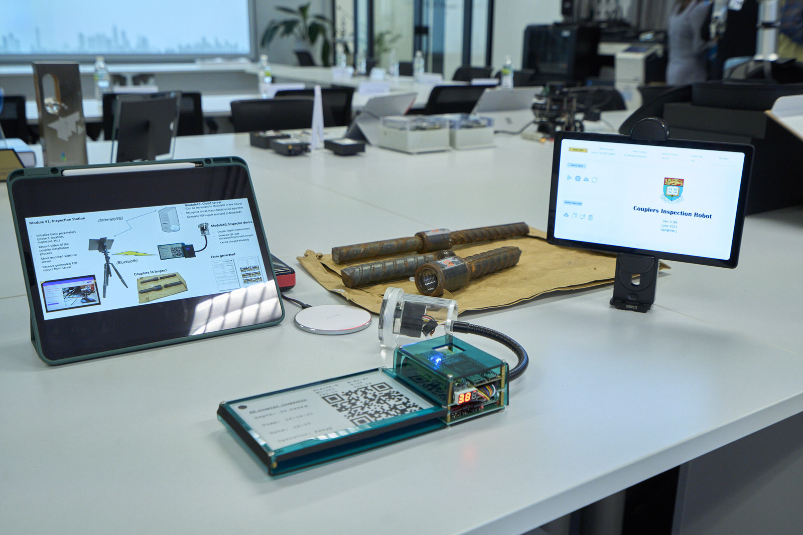 Couplers are widely used to connect reinforcement bars in construction sites. For inspection purposes, details of couplers (e.g., lengths, depths, in-positions) are usually documented in paper records, which are easily lost and prone to error. To solve this problem, the iLab team has developed the Coupler Inspector Robot with wireless charging, which can measure the depth of a coupler, record time, date and operator then automatically generates the inspection records as specified. It ensures the accuracy of data and offers greater convenience in retrieving the records.