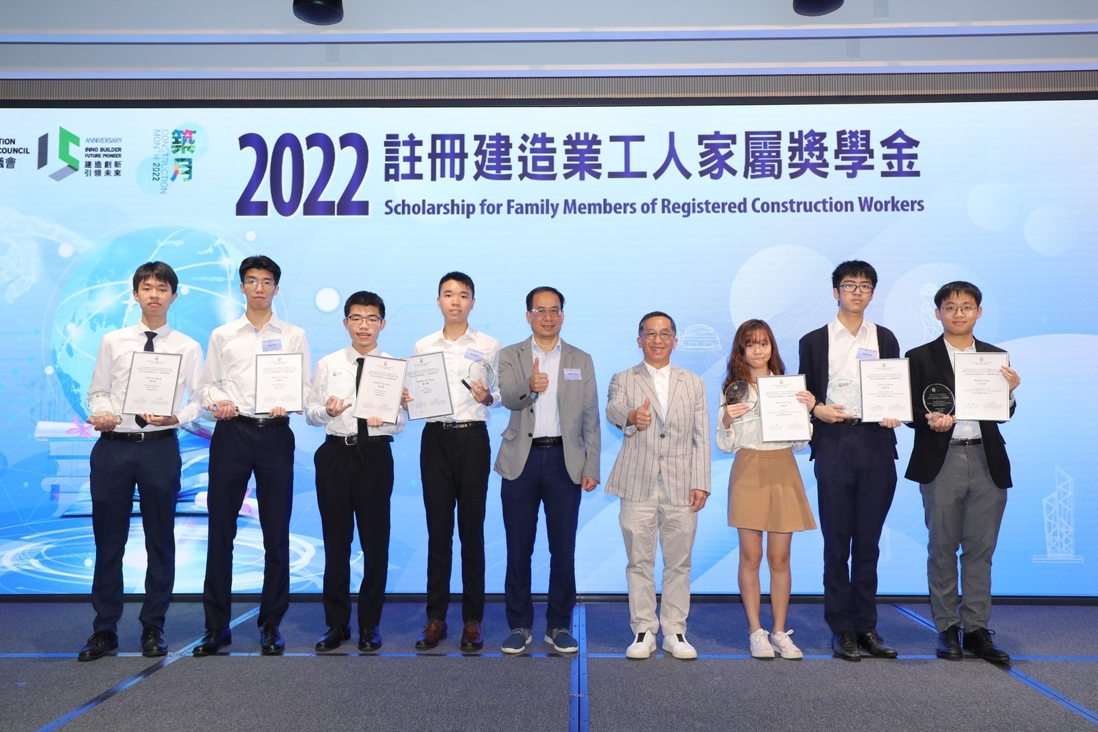 The Construction Industry Council (CIC) is committed to attract young people to join the construction industry as the development of young people is closely connected to the future of Hong Kong. Ir Thomas HO On-sing, Chairman of the CIC, Ir Simon LIU Sing-pang, Chairperson of the Construction Workers Registration Board (CWRB) and CWRB members jointly attended the Scholarship for Family Members of Registered Construction Workers Award Ceremony 2022, acknowledging the outstanding achievements of the children of registered construction workers in the Hong Kong Diploma of Secondary Education Examination. They also celebrated with the awardees’ family members who are registered skilled workers.
