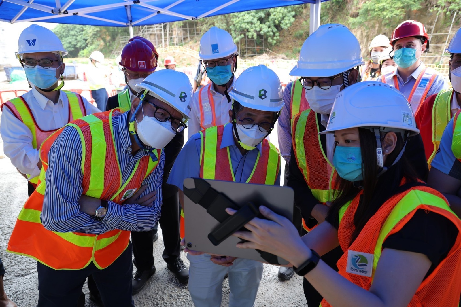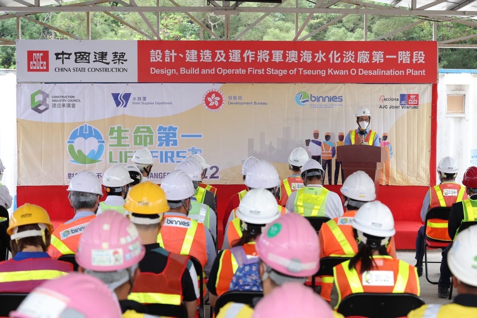 Apart from constant awareness, implementation of technology at construction sites is another tool to achieve “Life First”. As one of the Construction 2.0 projects spearheaded by the Water Supplies Department, Tseung Kwan O Desalination Plant aims to provide a stable supply of safe fresh water that will not be affected by extreme weather events. In its construction, highly efficient environmental management measures are implemented in conjunction with innovative digital technologies, including the flexible implementation of Building Information Modelling (BIM) and Artificial Intelligence Systems. These measures ensure safety at the construction site and a comprehensive management of site records, work progress and manpower management. In late May, Ir Ricky LAU, Permanent Secretary for Development (Works); Mr. LO Kwok Wah, Kelvin, Director of Water Supplies; Ir Thomas HO, Chairman of the CIC; Ir Albert CHENG, Executive Director of the CIC and Ir Dr. Derrick PANG, Chairperson of Committee on Construction Safety of the CIC visited the TKO Desalination Plant work site to study how the site puts innovative solutions to good use, so as to identify potential risks and implement appropriate safety measures. This visit also kicked off the “Life First” 2022 safety promotion campaign.