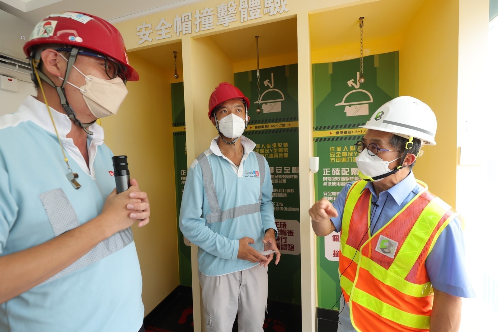The project team does not only apply technology in Design, Build & Operate, a Safety Training Centre and a VR Safety Experience Zone are set up for a 1-hour compulsory training and quiz to all newly employed workers. The Centre provides a number of VR safety experience stations and training, including equipment usage, first aid practice, safety helmet impact trial, fire suppression trial etc. These trainings actualise the safety concept and put forward the experiential learning experiences. As a result, it enhances the training effect. Ir Ricky Lau and Ir Thomas Ho had a run on the safety helmet impact trial. Though seemingly a simple step, all frontline workers are clearly reminded of the importance of properly wearing the helmet and prevention of serious accidents. "Life First" is reinforced and implemented at the site.