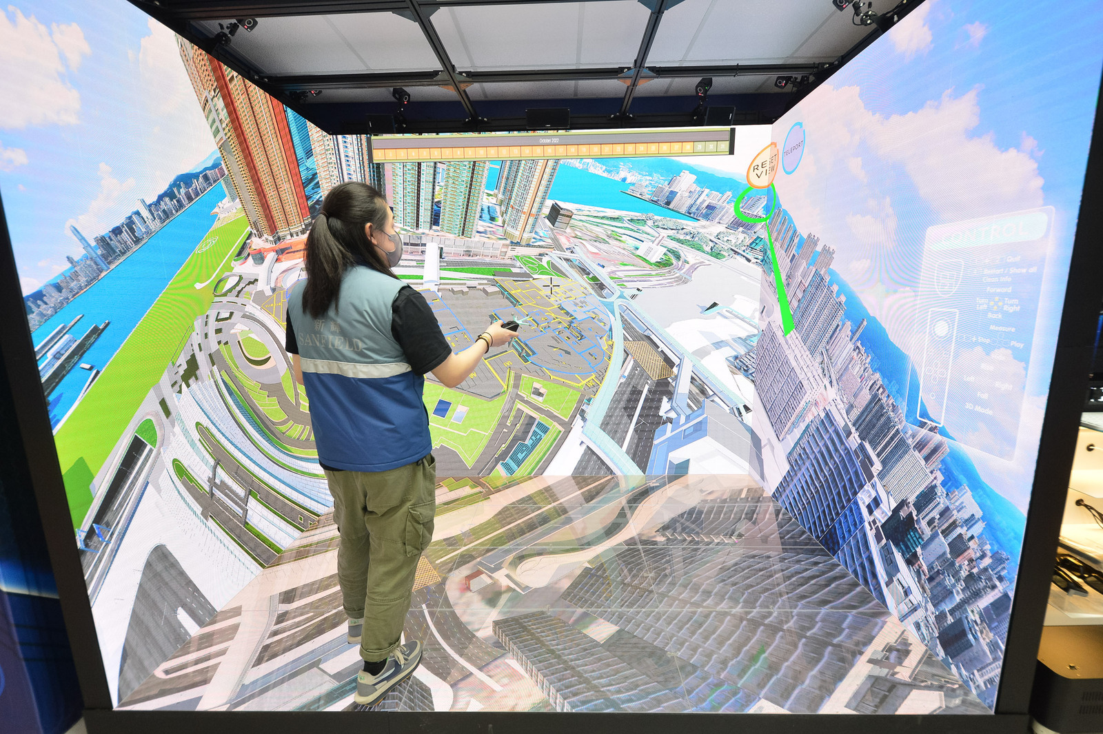 With digital technology infiltrating all corners of the construction industry, the demand for tech talent is increasing day by day. The team uses a dedicated VR Computer-Automatic Virtual Environment (V CAVE) to assist in precise supervision and anticipation when facing such large-scale commercial projects. By inputting Building Information Modeling (BIM) data into the system, converting 2D images into 3D graphics, and providing a 1:1 immersive experience to all users, the team can easily identify, coordinate, and eliminate conflicts before construction. After listening to the presentation and demonstration of the equipment by BIM Engineer, Kenneth TANG, Ir HO was impressed by his work and encourages more young generation continue to explore and develop in the field of BIM.