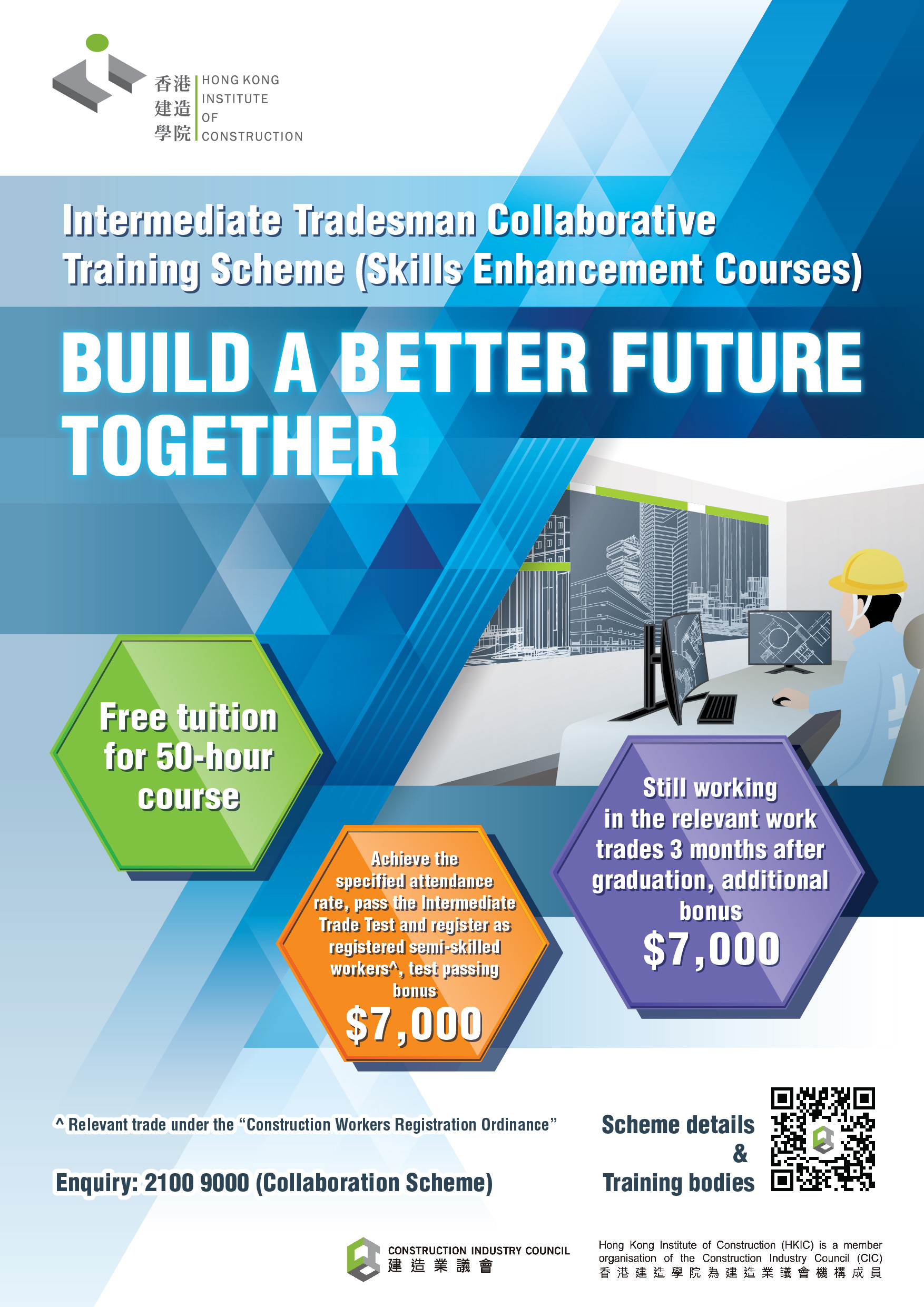 To alleviate semi-skilled manpower shortage in construction industry, with the support of Development Bureau, the Construction Industry Council (CIC) launches the "Intermediate Tradesman Collaborative Training Scheme (Skills Enhancement Courses)" to train up registered general workers to become semi-skilled workers.