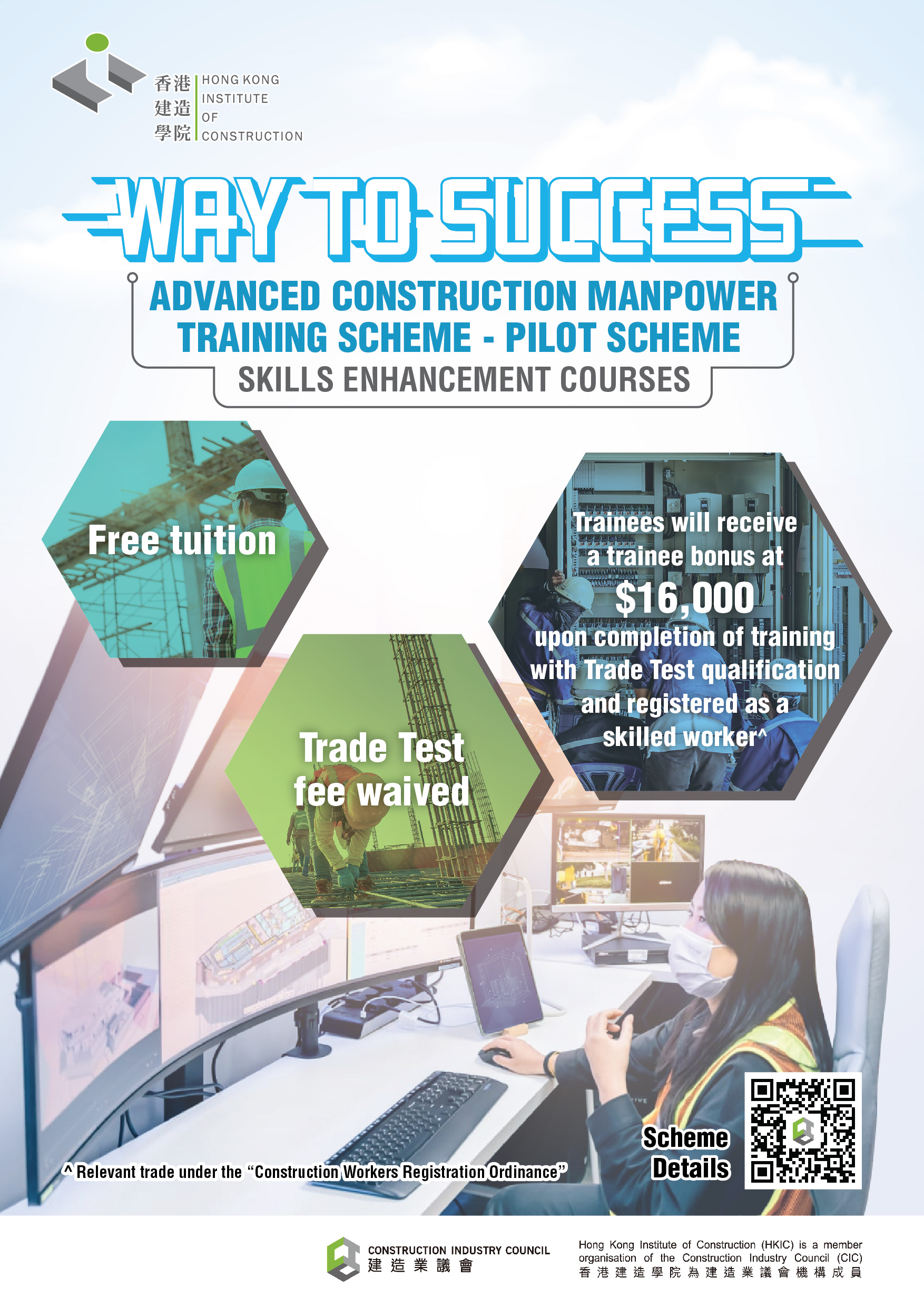 To alleviate manpower shortage in construction industry, with the support of Development Bureau, the Construction Industry Council (CIC) launches the "Advanced Construction Manpower Training Scheme - Pilot Scheme (Skills Enhancement Courses)" to train up semi-skilled workers to become skilled workers.